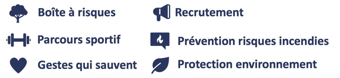 A disposition du réseau associatif des sapeurs-pompiers de France (Amicales de casernes, unions départementales et régionales de sapeurs-pompiers) mais aussi aux services d’incendie et de secours, et aux collectivités territoriales, il permet de renforcer la nécessité de susciter des vocations, animer les territoires sur les risques inhérents.