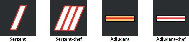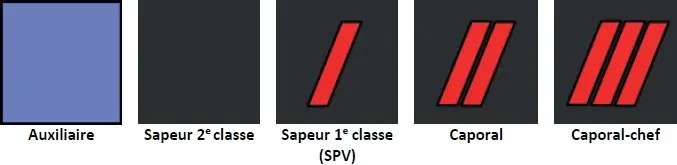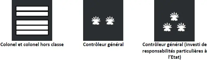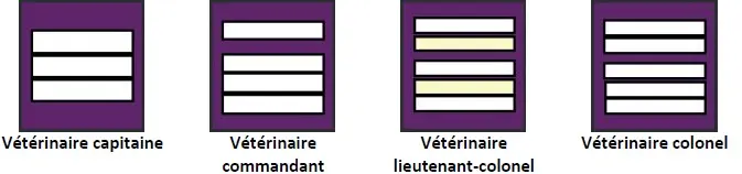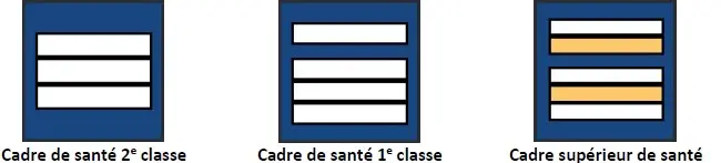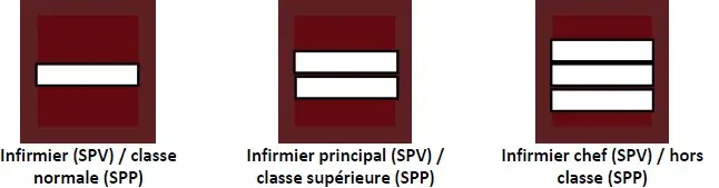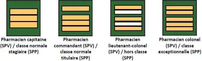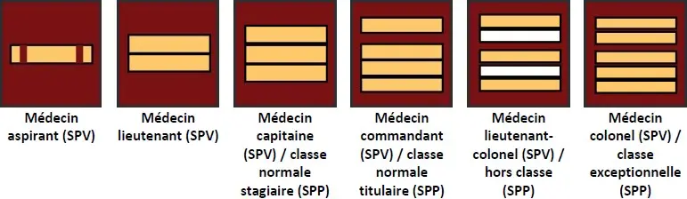 Les personnels du Service de santé et de secours médical ont des attributs de grades de capitaine, commandant, lieutenant-colonel et colonel. Seule la couleur des épaulettes varie selon le métier.