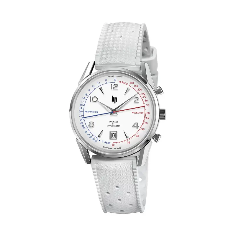 Baptisée selon la célèbre devise des Sapeurs-Pompiers de France « Courage et Dévouement » qui est inscrite sur son cadran, cette montre possède un boîtier en acier inoxydable poli de 35 mm monté sur un premier bracelet Tropic blanc. Etanche à 50 m.