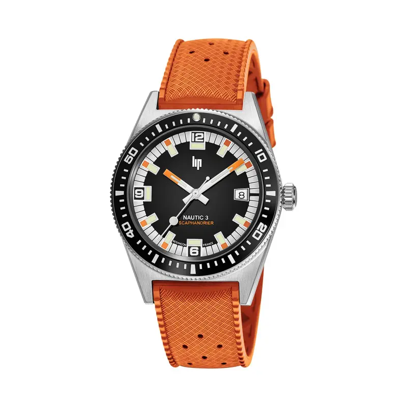 Montre de plongée étanche à 200 m, réserve de marche de 68 heures en pleine charge, boîtier en acier inoxydable poli et brossé de 39 mm monté sur un premier bracelet Tropic orange adaptable à tous poignets. Cadran noir mat, marqué « Scaphandrier ».